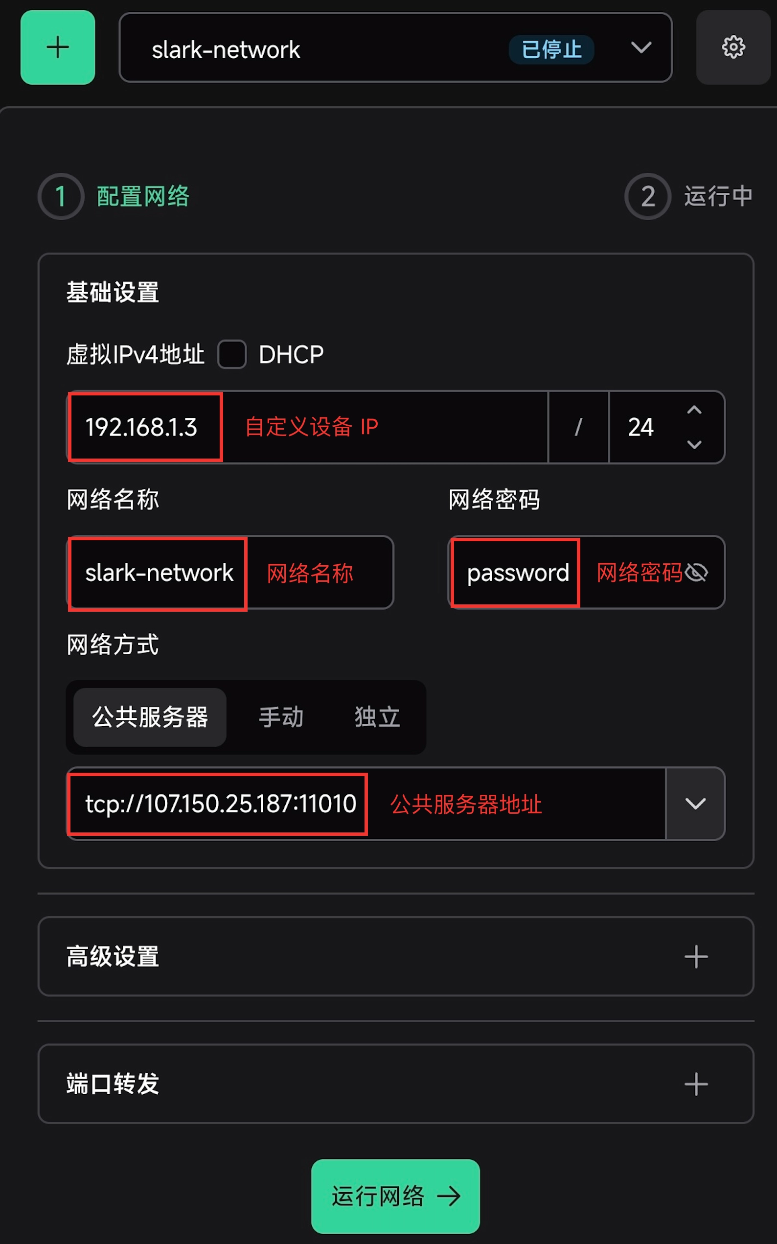command: -i 192.168.1.2 --network-name slark-network --network-secret password -e tcp://107.150.25.187:11010 -l 11010 --hostname=fnOS --proxy-networks 192.168.2.0/24下面来解释下需要修改的参数: